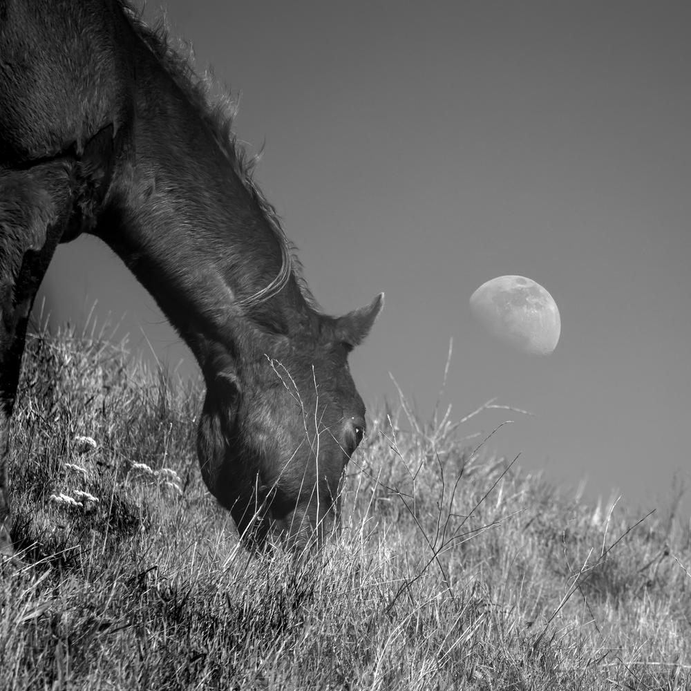 Rosie grazes in the hush of evening, where the last light softens and the moon ascends like an ancient blessing. On Horse Hill, beneath that silver glow, she becomes part of the stillness itself, a quiet hymn to earth and sky.