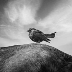 A cowbird rides along on the back of a Horse Hill herd member, echoing an old rhythm of the plains. The species earned its name by following vast herds like bison, seizing the insects stirred from the grass as the animals pushed onward.
